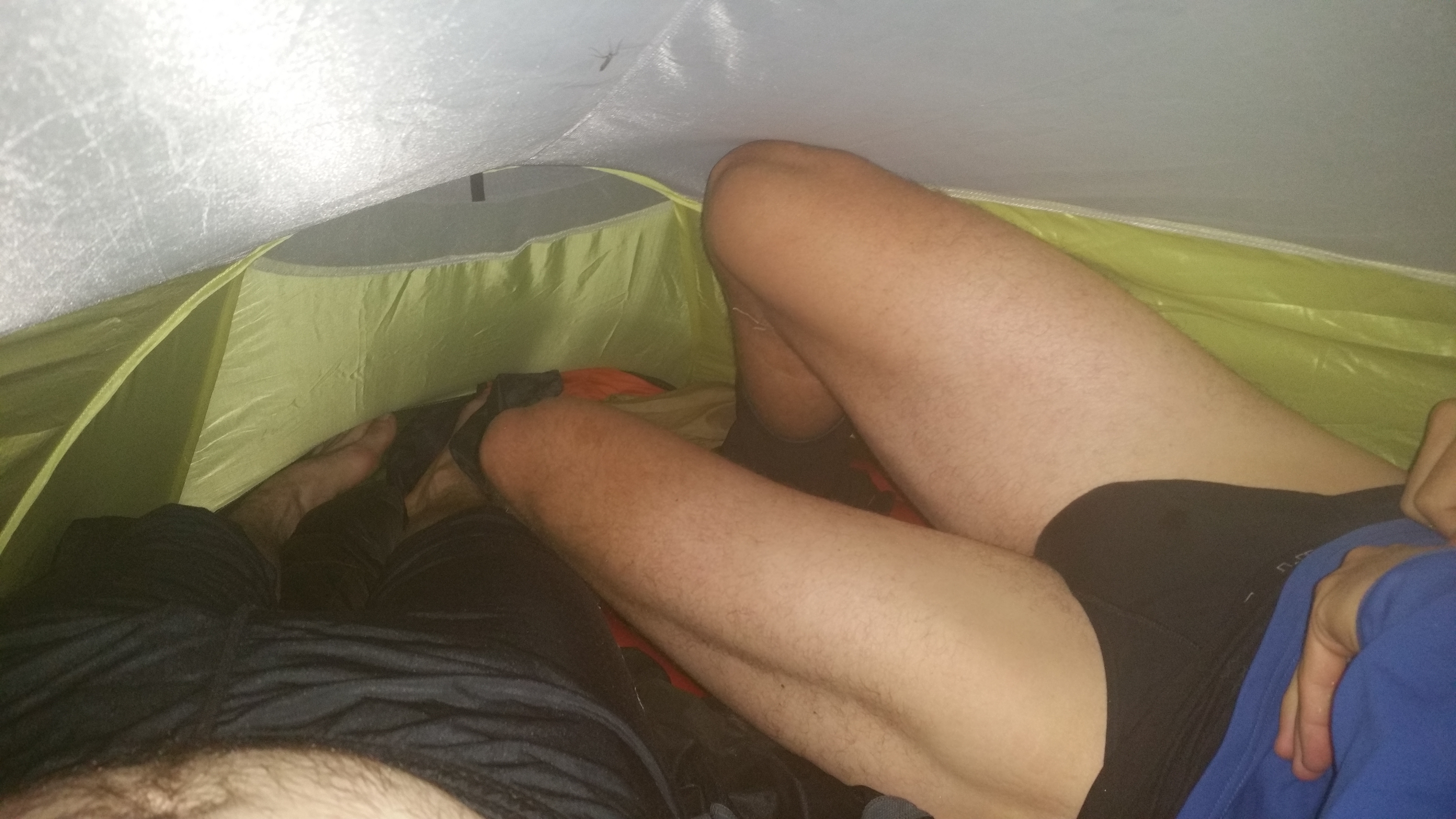Enfin le bivouac. Ouff on est rincé. Mais qu’est-ce qu’on a mal aux pieds c’est fou! 18,5km 4h46 1100m D+ 1250m D-. Le bivouac est séparé en deux car pas assez de places dans les 2 prés. On tâtonne pour trouver quelque chose de plat pas loin d’un mini ruisseau. Une sardine d‘une tente voisine attaque Quentin au pied. On s’installe et on va boire une bière. Deux même! Y a un monde pas possible et il faut 20min à Quentin pour revenir avec ce petit breuvage. Bon ok titi c’est un peu tricher ça mais on ne va pas cracher dessus. Evidemment on a pris ce qu’il faut dans le sac en monnaie (et du saucisson). A la seconde bière y a un type qui me demande: “Si je te donne 2 pièces de 50 centimes et que tu me donnes 1€ en échange, je m’allège pour demain!” Ça nous fait bien marrer et je compatis… A la bouffe maintenant. Au menu: bolino, pâtes au curry, saucisson, fruits secs. On est bien! La pluie arrive plus tard que prévue et tant mieux. On rentre dans la tente donc vers 22h15. C’est pas très très grand mais heureusement qu’on n’a pas la tente à jphi! Avec ce qu’il tombe et le vent dehors, c’est limite tempête. On se met quasiment à poil tellement on a chaud. (Dis-moi pas qu’il y aurait encore un rat dans la tente…). Quentin se couche moins con après avoir appris à mettre ses pieds dans des poches plastiques pour être au sec au bivouac. Yes, c’est beau le partage!
